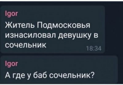 - Россияне все пьют боярышник, жрут гнилые фрукты и роются в обьедках из пятёрочки. - Постой постой, а это не ты ли в синей майке и желтых штанах торчишь на нашей помойке рядом с пятерочкой? - Ну я, и шо? Имею право. Это мой выбор, я свободный человек. |