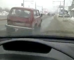Нива без заднего колеса движется по дороге